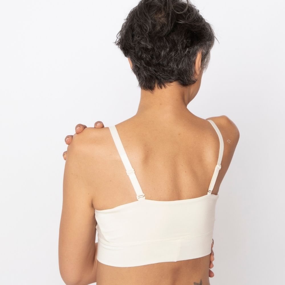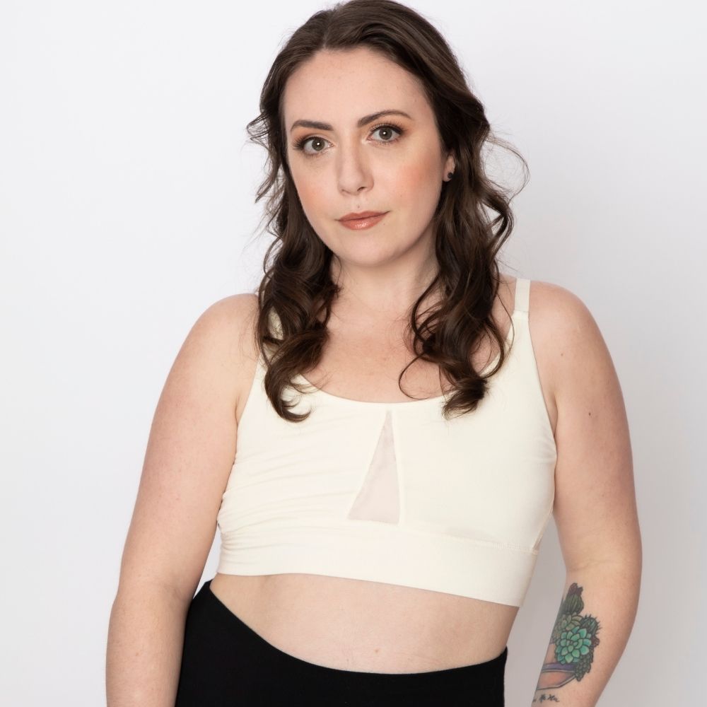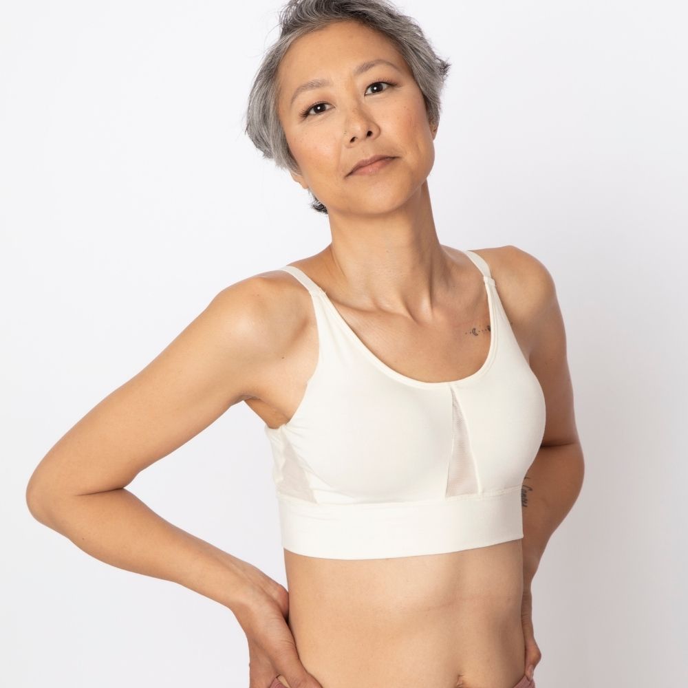- An eco-friendly pocketed bralette that checks aff all the boxes and is perfect for post-surgery. Super soft modal material that sits beautifully against a flat chest will keep you cool and comfortable all day long. The Leslie Leisure Bralette is flexible and never restrictive. This bra has plenty of stretch, allowing you to put it on by pulling it over your head or stepping into it, making it a perfect post-surgery bra
