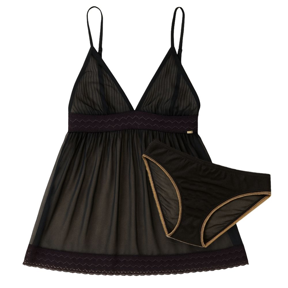 - Transform your bedtime look with this must-have mesh babydoll and brief set. Featuring bold lace features and soft gold trim that will elevate your style, this pocketed piece is lightweight and semi-sheer for added confidence. Embrace yourself and have fun with this flattering addition to your lingerie collection