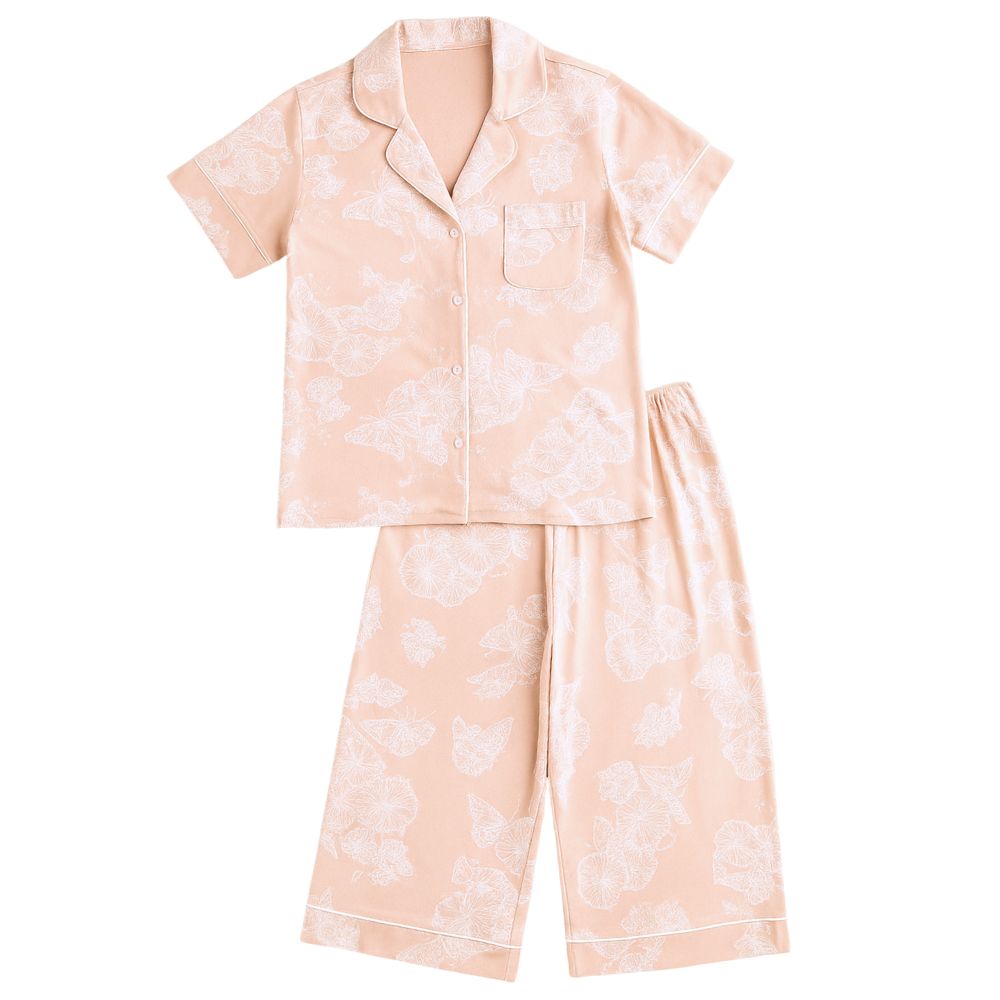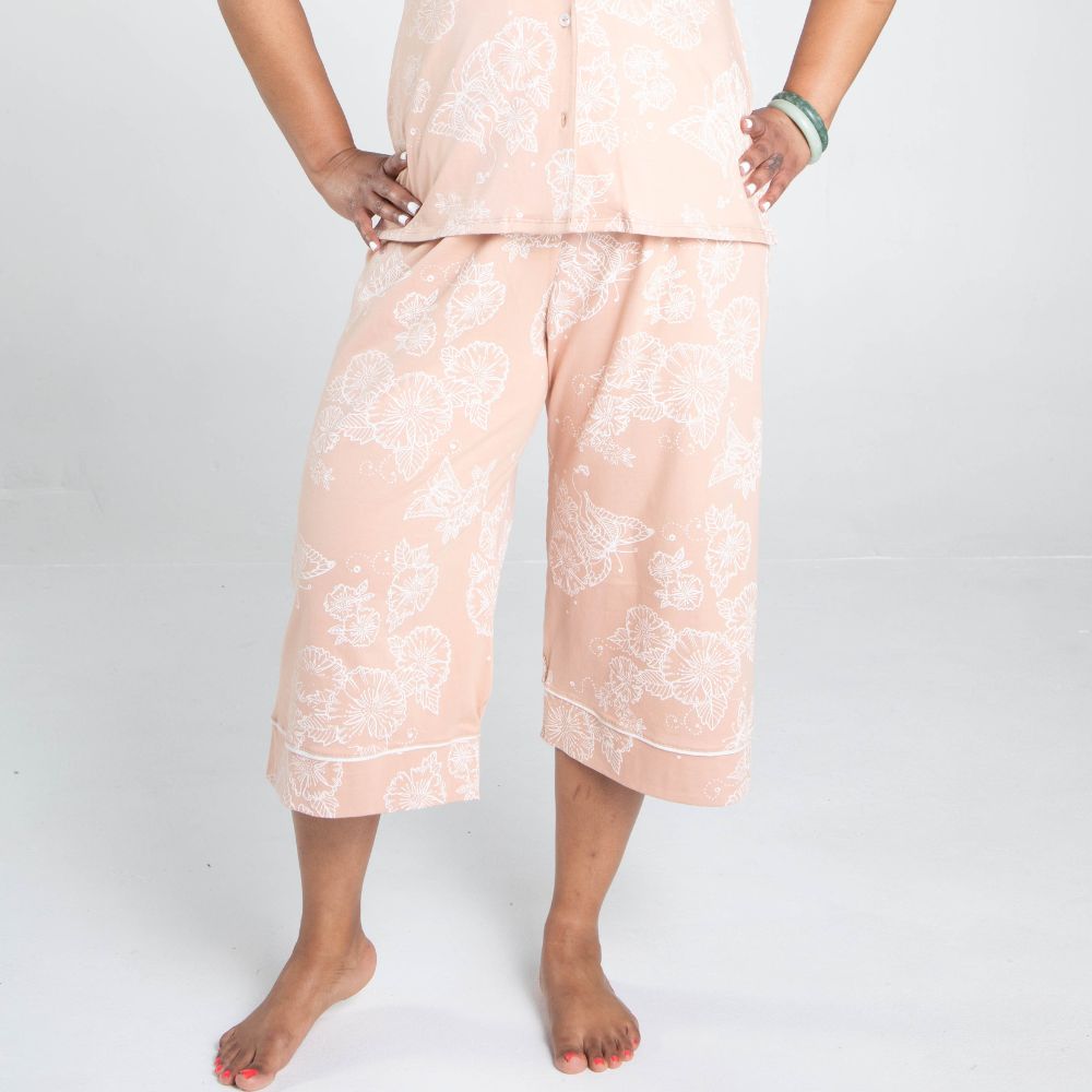 • Made from ultra-soft, breathable cotton fabric, this two-piece PJ set features a button-down top and relaxed-fit cropped pants with an elastic waist and contrast satin piping